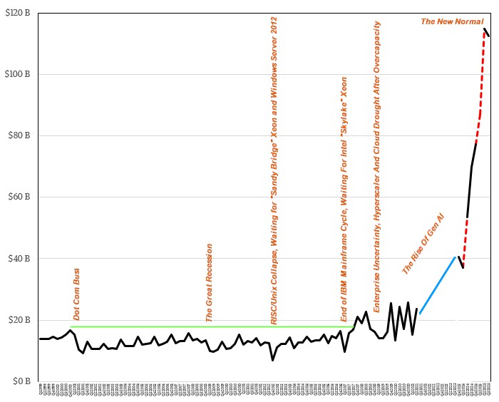 You cannot see the long buildup to even reach $12 billion or $13 billion a quarter in server sales per quarter in 1999, and that was when RISC/Unix systems were the hot commodity, X86 servers were on the rise, and IBM and a few others were still making very profitable billions of dollars selling proprietary systems. This was very much an enterprise systems market with the hyperscalers on the rise during the Dot Com Boom.